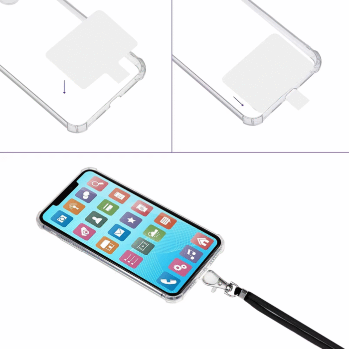 Dzięki dołączonej przezroczystej plakietce, pasek współpracuje z niemal każdą kombinacją telefonu i etui. Nie musisz zdejmować pokrowca - po prostu włóż plakietkę pomiędzy telefon a etui, a następnie przypnij smycz do metalowego zaczepu.